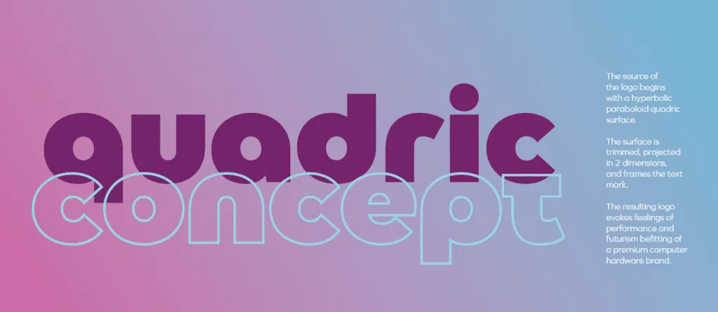 The source of the logo begins with a hyperbolic paraboloid quadric surface. The surface is trimmed, projected in 2 dimensions, and frames the text mark. The resulting logo evokes feelings of performance and futurism befitting of a premium computer hardware brand.